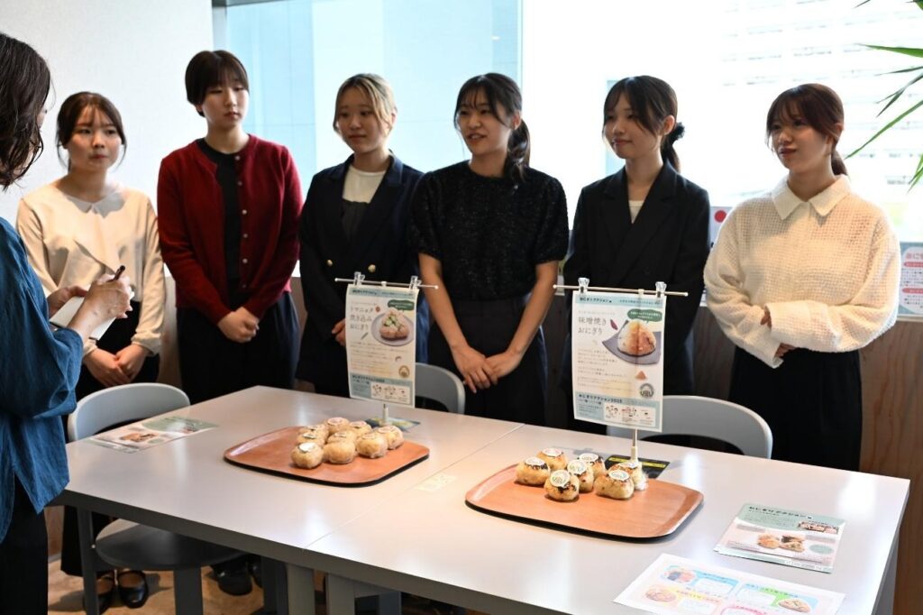 記者発表会では、学生たちが自らの言葉で開発したおにぎりを紹介し、試食に訪れた参加者からは「おいしい!」と笑顔が広がりました。